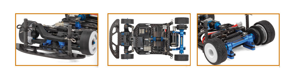 This one was completely out of left field! When I saw a new 1/28 from TA I assumed it was another vehicle based on the SC28/MT28/RC28/RC28T platform but I couldn’t have been more wrong! The new RC28R (or RC28 as it is listed in some places) is a 2wd, pan car style race kit that is all about performance. Associated took their decades of pan car racing knowledge and success and shrunk it down to 1/28 to create this tiny on-road missile. A floating rear pod with center shock, a fixed-arm front end with included optional upper arms to adjust caster and camber, three torsion side links are include din the package (soft, medium and hard), a steel chassis plate lowers the COG and keeps chassis flex in check, and both polycarbonate and ABS body mount options are included right out of the box.